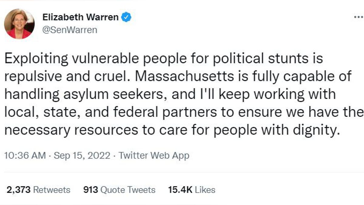 "Exploiting vulnerable people for political stunts is repulsive and cruel. Massachusetts is fully capable of handling asylum seekers, and I'll keep working with local, state, and federal partners to ensure we have the necessary resources to care for people with dignity," Warren tweeted.