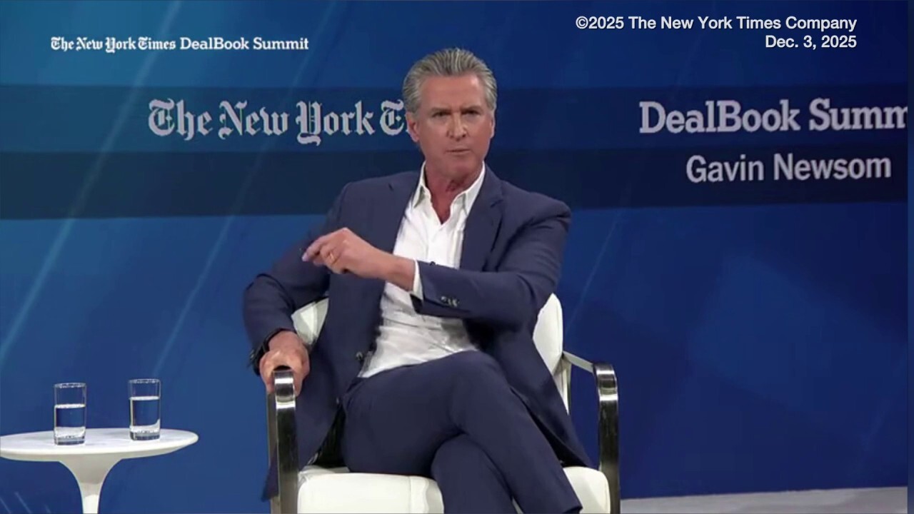 California , Gavin , habla en la cumbre New York Times en la ciudad de Nueva York el 3 de diciembre de 2025. (Michael .Getty Images)