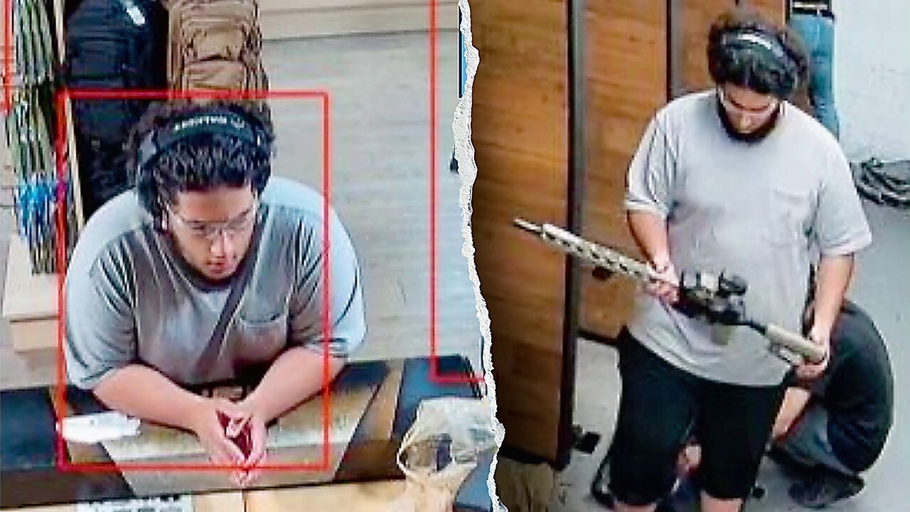 Esta imagen dividida muestra, a la izquierda, una imagen de vigilancia de dos sospechosos en el mostrador de un campo de tiro en Michigan y, a la derecha, una selfie que un sospechoso de Nueva Jersey supuestamente tomó y envió a sus amigos después de difuminar su rostro. (Distrito Este de Michigan, Distrito de Nueva Jersey)