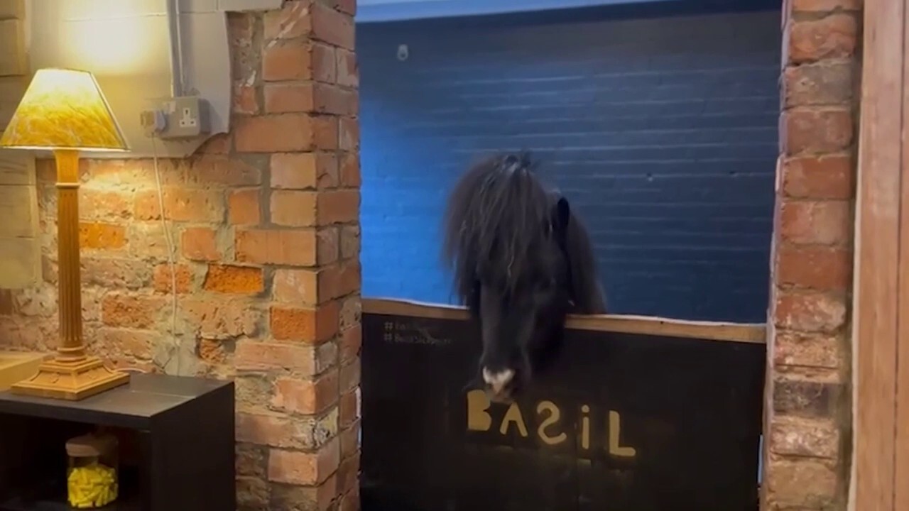 El poni en miniatura Basil ofrece una cálida bienvenida a los visitantes de este refugio único