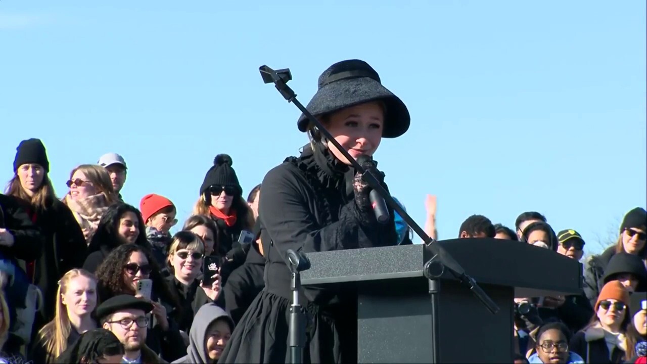 Una actriz que interpretaba a Mary Todd , esposa del expresidente Abraham , pronunció un discurso fúnebre durante un funeral simbólico por la moneda de un centavo en el Monumento a Lincoln Washington, D.C. en Washington, D.C. el sábado. (Crédito: WTTG)